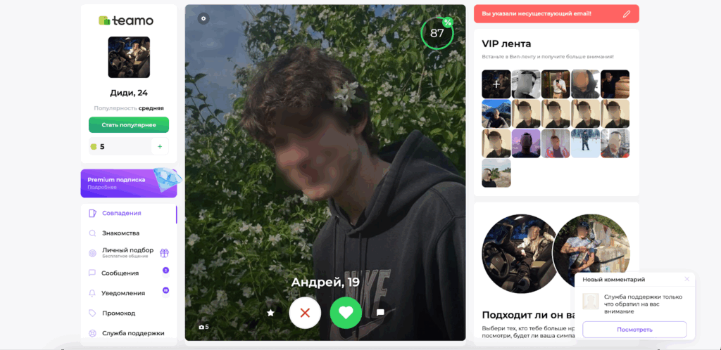 Teamo спасает от бездумного пролистывания анкет и пустых диалогов! Научный подход правит бал на этой интеллектуальной платформе. Каждый начинает путь с глубокого психологического тестирования своей личности.
