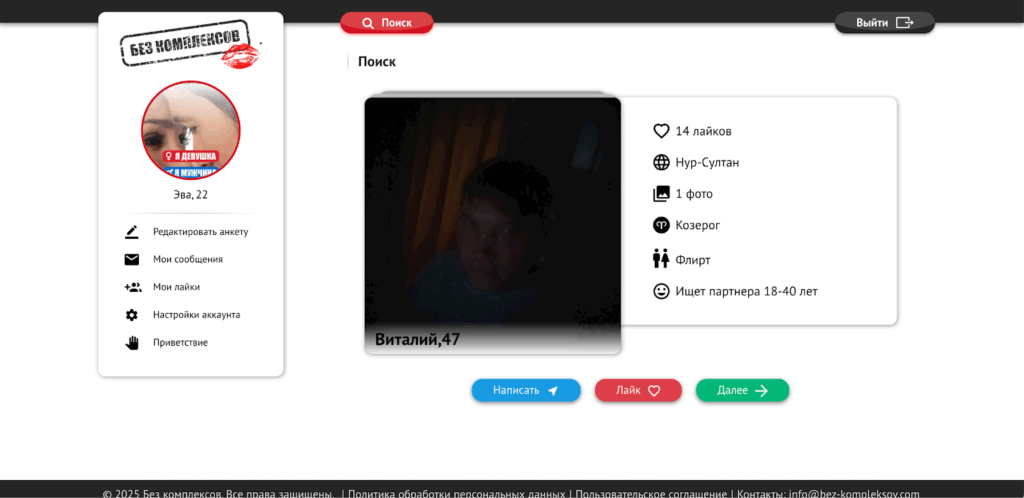 БезКомплексов создает ощущение дружеской беседы на кухне в три часа ночи, где можно обсудить практически любые темы, не боясь осуждения. Однако сервис страдает от катастрофического перекоса в гендерном составе — мужчин значительно больше, чем женщин, прямо как на факультете физики или в очереди в туалет на рок-концерте. К тому же, проблема фальшивых аккаунтов здесь стоит особенно остро — некоторые профили выглядят менее реалистично, чем инопланетяне в фильмах категории Б.