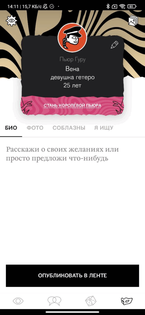 Pure напоминает увлекательную игру со временем и адреналином. Вы создаете объявление, находите заинтересованного собеседника и имеете ровно сутки на то, чтобы договориться о встрече — идеально для тех, кто принимает решения быстрее, чем кофемашина варит эспрессо. Для женщин сервис бесплатен, мужчинам придется заплатить от 799 рублей за неделю использования — гендерное неравенство в действии, но таковы правила игры.