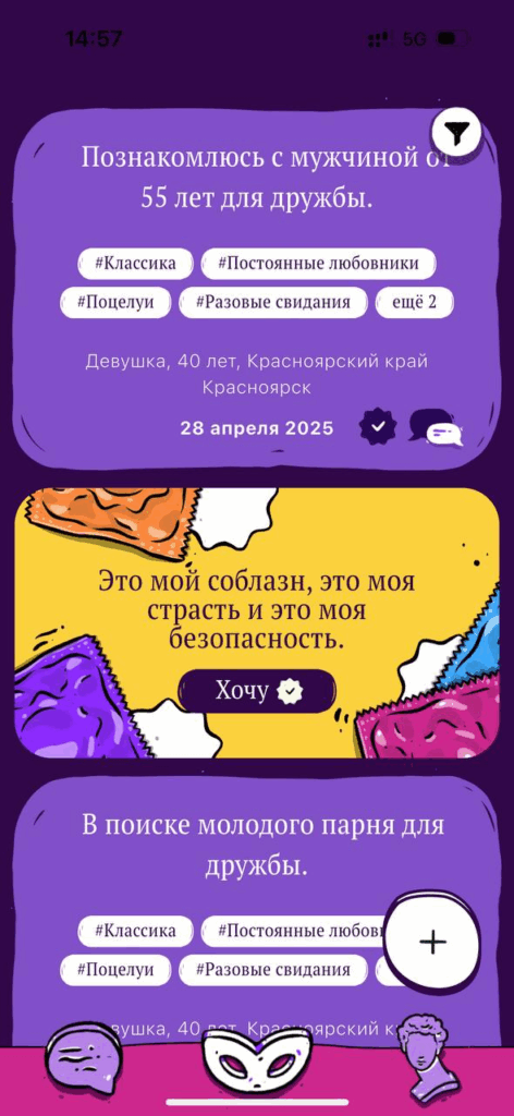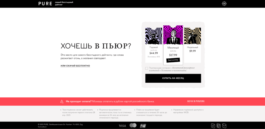 Pure ориентирован на тех, кто хочет анонимности и ясности намерений. Здесь нет долгих переписок: цель встречи указывается сразу. Уникальная особенность Pure — анкеты исчезают через сутки, а значит, нет истории сообщений и лишних следов. Среди популярных сайтов знакомств в Красноярске Pure занимает особое место за счёт приватности. Женщины могут пользоваться сервисом бесплатно, а для мужчин подписка обойдётся от 499 рублей в неделю. Стоимость немаленькая, но за приватность приходится платить.
