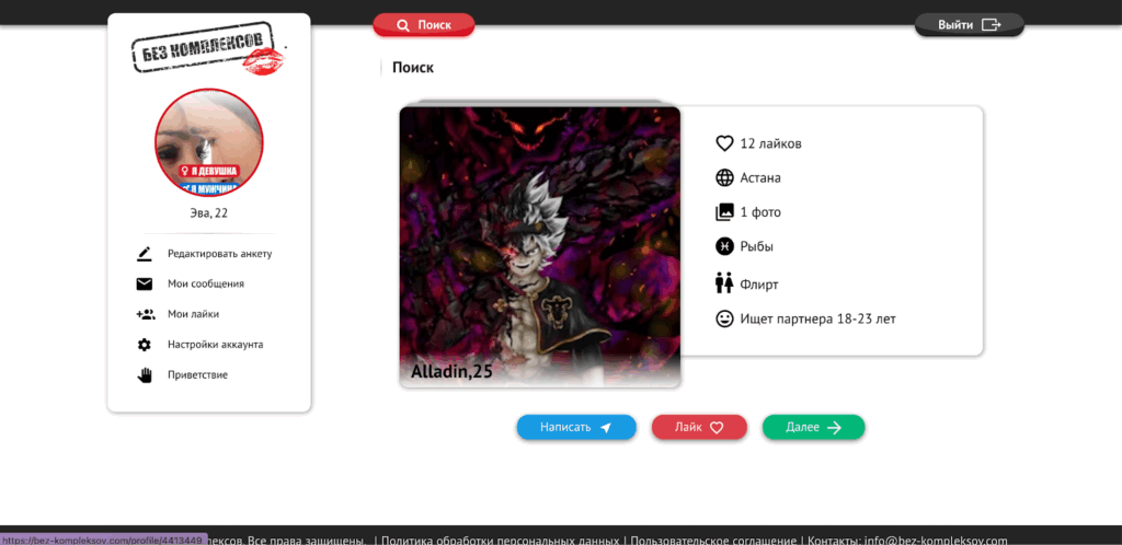 «Без комплексов» подойдёт тем, кто ищет открытое общение. Регистрация проходит через ВКонтакте за пару минут. Сайт отличается простотой и прямотой. Среди лучших сайтов знакомств в Красноярске платформа выделяется честностью анкет. Платная версия за 379 рублей даёт расширенный поиск и новые возможности.