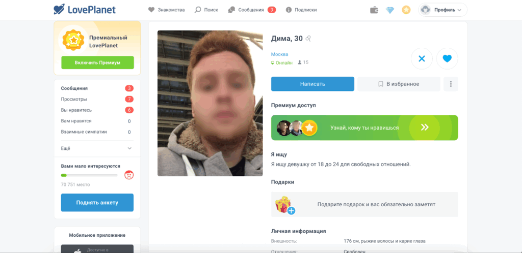 LovePlanet — старожил рынка онлайн-знакомств. Платформа работает с 2005 года и не теряет популярности. В Красноярске сервис хорошо знают и активно используют. Большая база анкет даёт больше шансов найти подходящего человека. Среди топ сайтов знакомств в Красноярске LovePlanet занимает стабильную позицию за счёт доверия пользователей. Базовая подписка стоит от 199 рублей в месяц. Приложение удобно для общения в дороге или на отдыхе.
