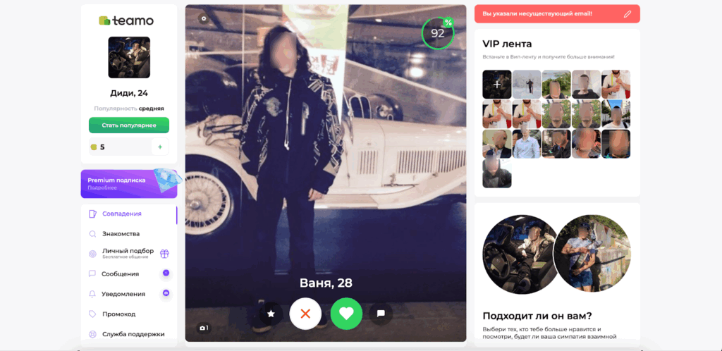 Teamo отличается научным подходом: здесь не просто ставят лайки на фото, а подбирают партнёров на основе психологических тестов. Это делает его одним из наиболее продуманных среди сайтов знакомств в Красноярске. Сервис подойдёт людям, уставшим от случайных совпадений. За 790 рублей в месяц открывается полный функционал, включая доступ к детальным результатам тестов. Минус в том, что молодёжи на платформе немного — в основном аудитория старше 30 лет, ориентированная на серьёзные отношения и семью.