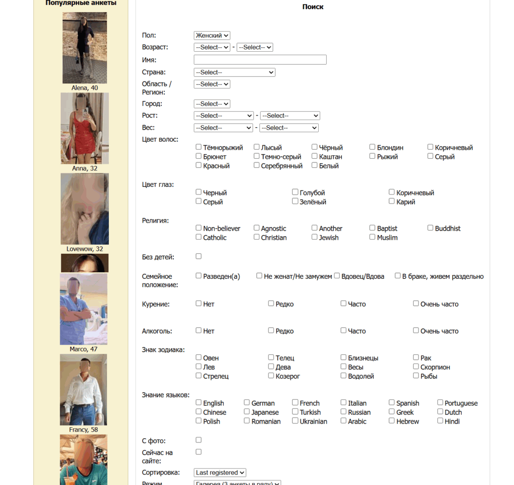 • Поиск по параметрам — возраст, страна, город и еще куче дотошных параметров
