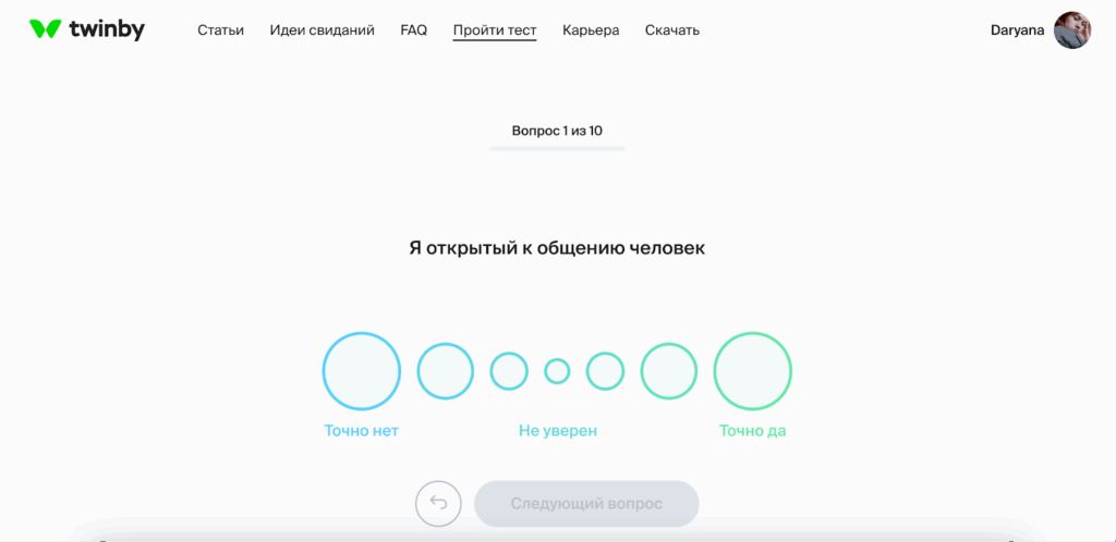 Так что представляет собой этот Twinby и стоит ли вокруг него столько шума? После ухода крупных западных сервисов разработчики решили заполнить пустоту, продвигая свой продукт как «революционный подход к поиску второй половинки через науку». На практике — утомительный марафон тестирования личности, который якобы найдет вам идеальную пару по каким-то таинственным алгоритмам.
