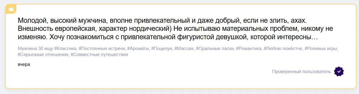 Masked.Love позволяет смотреть объявления без регистрации и сохранять полную анонимность. Фильтры по типу отношений работают точно: можно выбрать флирт, БДСМ или долгосрочные связи, а модераторы круглосуточно отсеивают фейков и неадекватов. За небольшой взнос открывается возможность выделить объявление в топ. Подходит, если не хочешь делиться лишним до первого доверия.