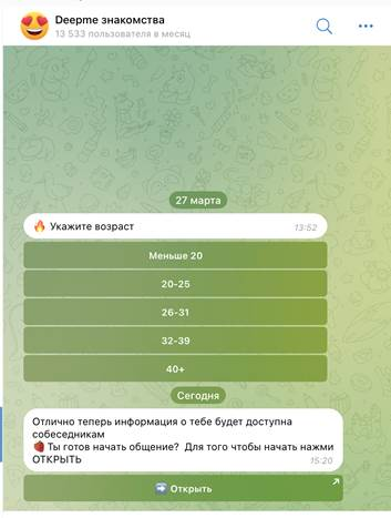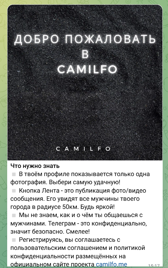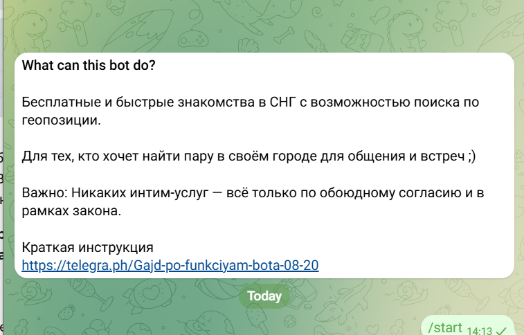 Новичок среди топ телеграмм чатов знакомств для встреч, но уже завоевал аудиторию благодаря честности. Сразу спрашивает о целях: общение, интим или серьезные отношения.