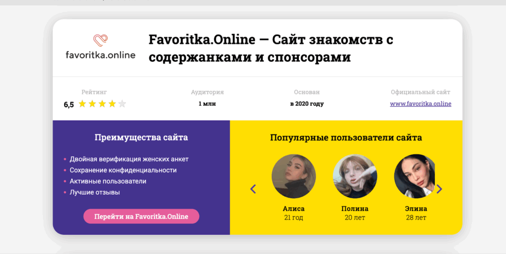 - Favoritka ★★★☆☆ — эксклюзивные знакомства, от 990 руб/месяц