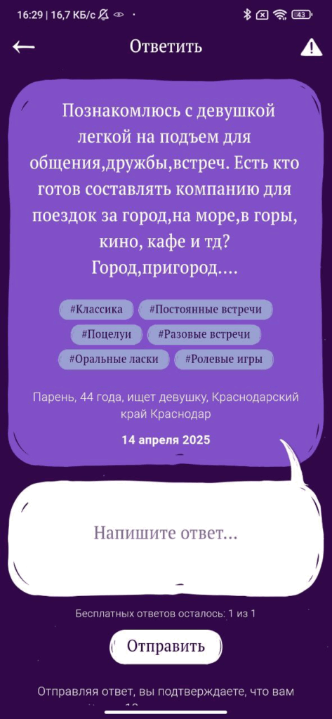Pure — находка для тех, кто ценит скорость и приватность. Настроил профиль за минуту, опубликовал объявление — и через пару часов можно встречаться. Никаких долгих переписок и выяснений «кто ты такой». Топ приложений для секс знакомств немыслим без Pure — здесь всё заточено под быстрые и анонимные встречи.